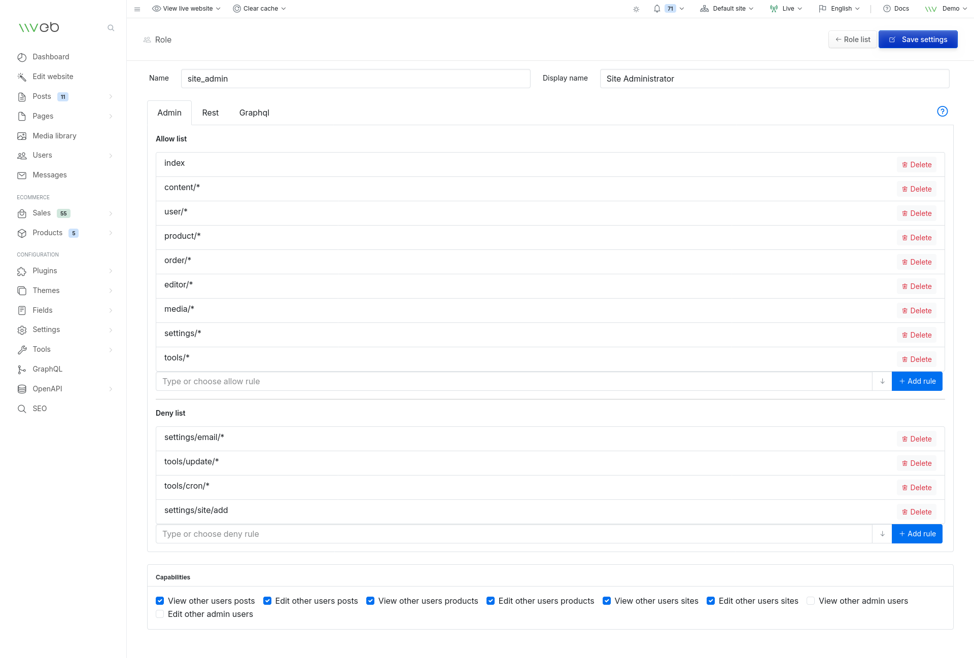 Vvveb includes several predefined roles to help you get started, and you can customize or create new roles based on your workflow.
