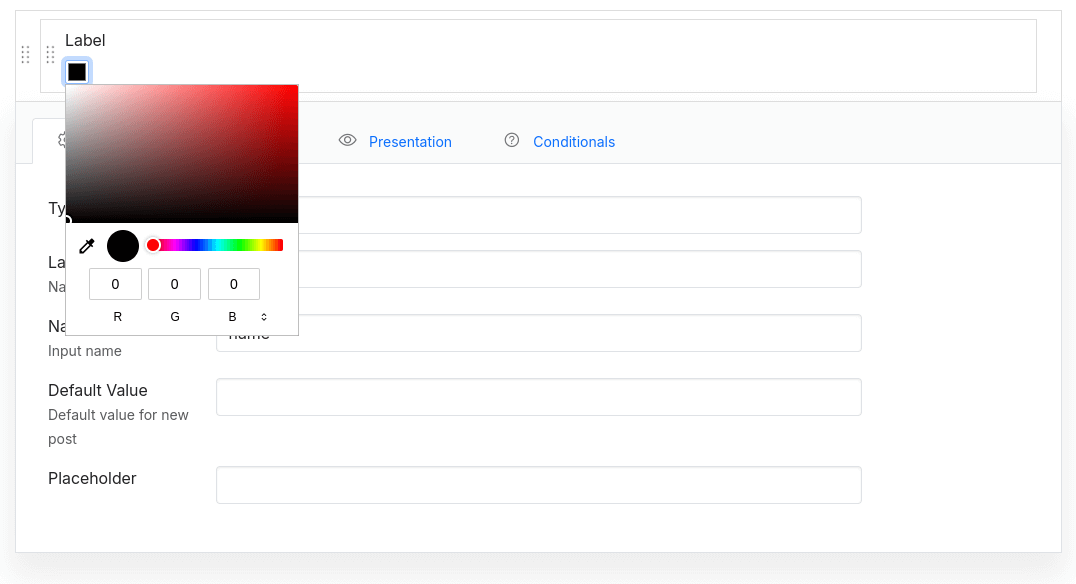 The Color field creates an color input, used for storing color values.