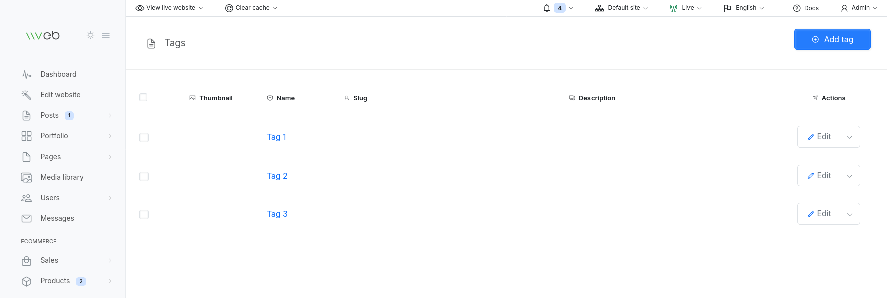 - Edit or delete tags from the Tags section in the admin