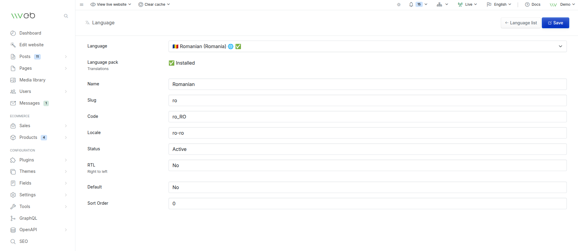 The Language settings page allows you to configure the languages available on your Vvveb site. Here you can edit language details, enable or disable languages, and install language packs for translations when available.