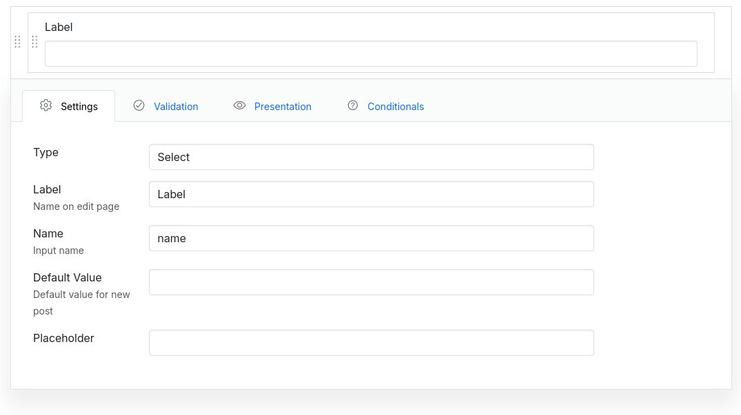 The Select field creates a dropdown list input, used for allowing the user to choose one value from the list.