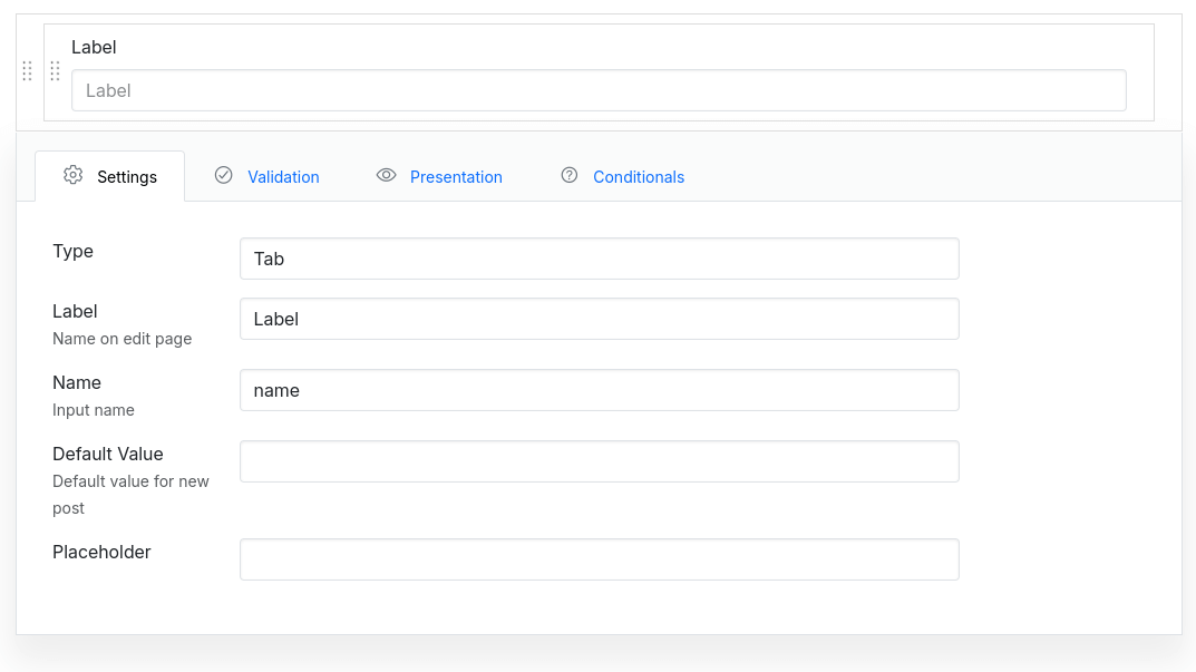The Tab field creates an tab input, used for storing tabbed values.