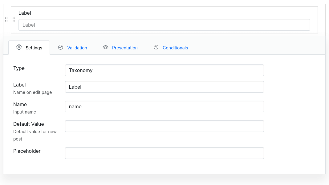 The Taxonomy field creates an taxonomy input, used for storing a taxonomy relation for the post.