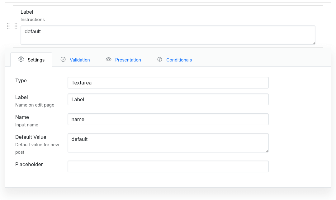 The Textarea field creates an textarea input, used for storing multi line text values.