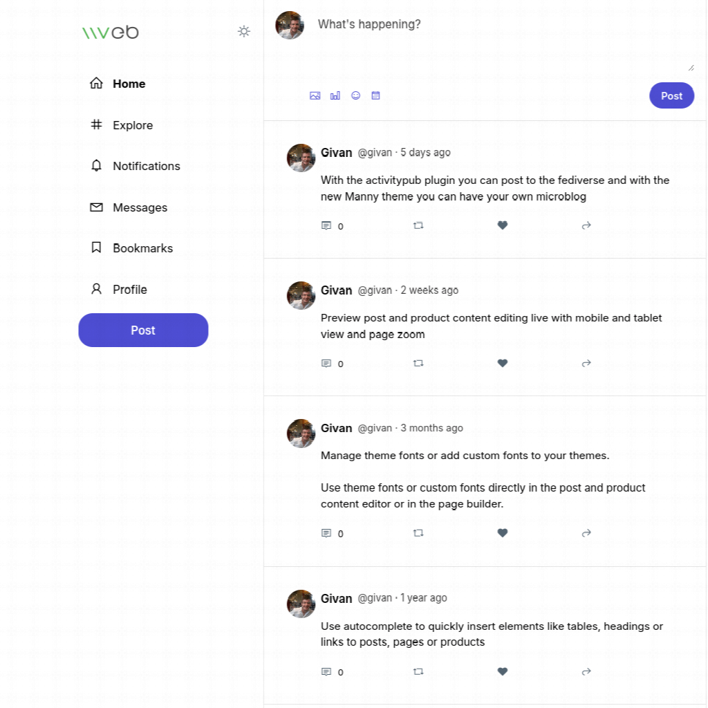 With the ActivityPub plugin installed, your Vvveb website functions as a federated profile, along with profiles for each admin user.