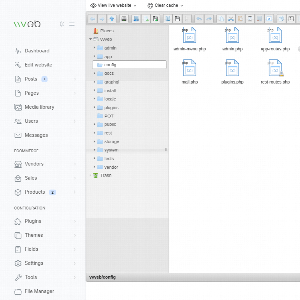 Manage all files from inside Vvveb folder. Supported operations edit, rename, upload, download, zip, unzip etc